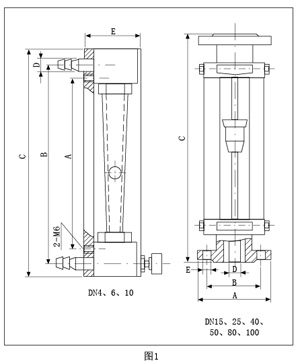 LZB/LZB-( )F流量計(jì)的錐管為光滑內(nèi)壁管(見圖4),通徑DN15以上的流量計(jì),浮子通過導(dǎo)桿 上下移動(dòng),保持穩(wěn)定;LZJ/LZJ-( )F流量計(jì)錐管 內(nèi)壁有三條導(dǎo)向凸筋,使浮子保持穩(wěn)定(見圖4)。通徑DN10以下的流量計(jì)采用軟管連接,配有 針形流量調(diào)節(jié)閥;通徑DN15以上流量計(jì)采用法蘭連接。